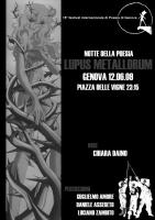 Venerdì 12 giugno, dalle ore 23.15, presso Piazza delle Vigne in occasione della Notte della Poesia, Chiara Daino declamerà estratti da Lupus Metallorum [ o delle nozze alchemiche e dell’opera al rosso ], durante il 15° Festival Internazionale di Poesia di Genova. Percussioni e Ritmiche: Guglielmo Amore, Daniele Assereto, Luciano Zambito.