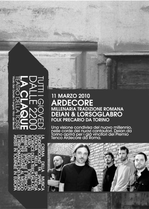I vincitori della Targa Tenco 2007, i romani Ardecore, arriveranno con il loro carico di stornelli e canzoni, vicende d`amore e morte, della lunga storia della nostra capitale. In apertura Deian scende da Torino a presentare il suo nuovo disco uscito per Snowdonia/Musicalista, passando per San Salvario e recuperando suo fratello Tristan in zona Maddalena. Concerto organizzato da: Disorder Drama