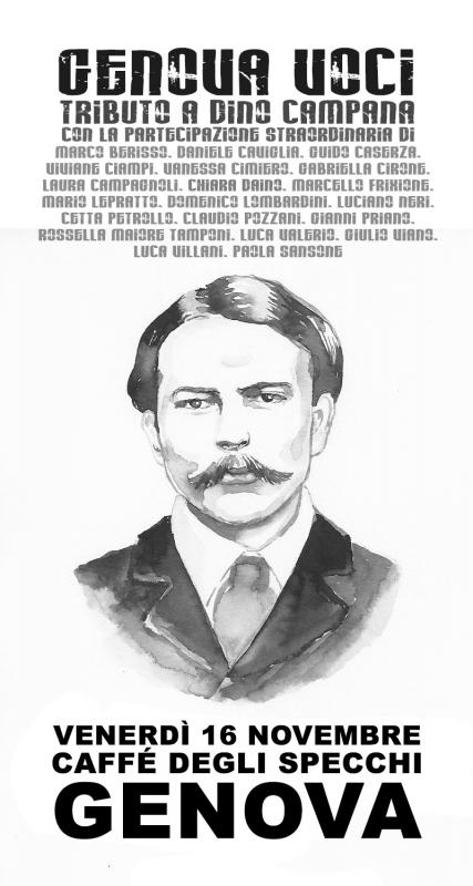 La Biblioteca Universitaria presenta GENOVA VOCI - Esecuzioni da Dino Campana - venerdì 16 novembre alle ore 17:30 a Genova presso il Caffè degli Specchi [Salita Pollaiuoli 43]. Con il patrocinio del Comune di Genova.